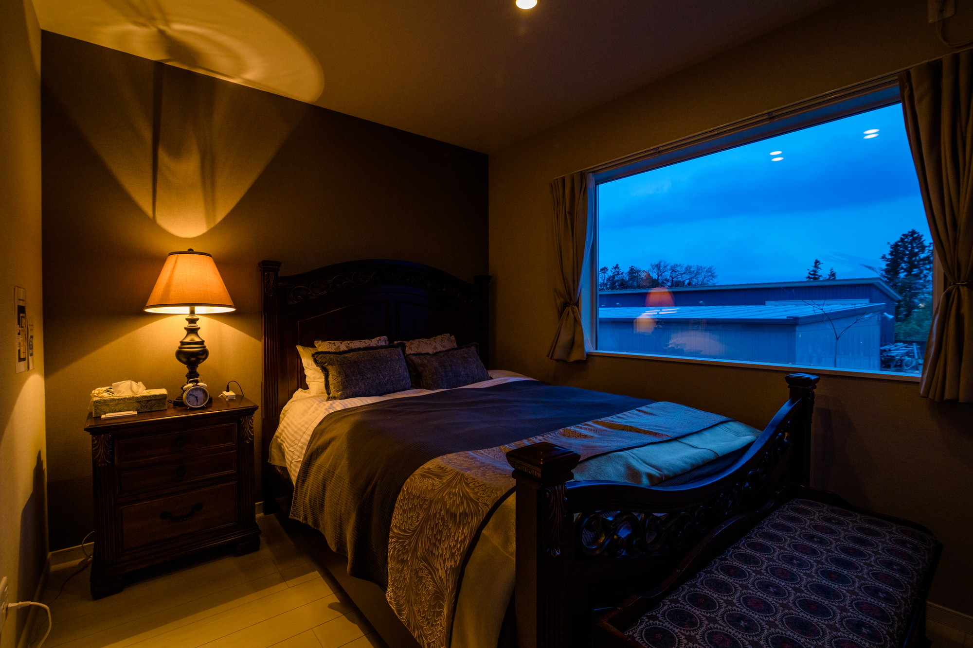 大人気家具ブランドアシュレイのクイーンサイズベットと棚がきらりと光る寝室からは富士山が眺望いただけます。